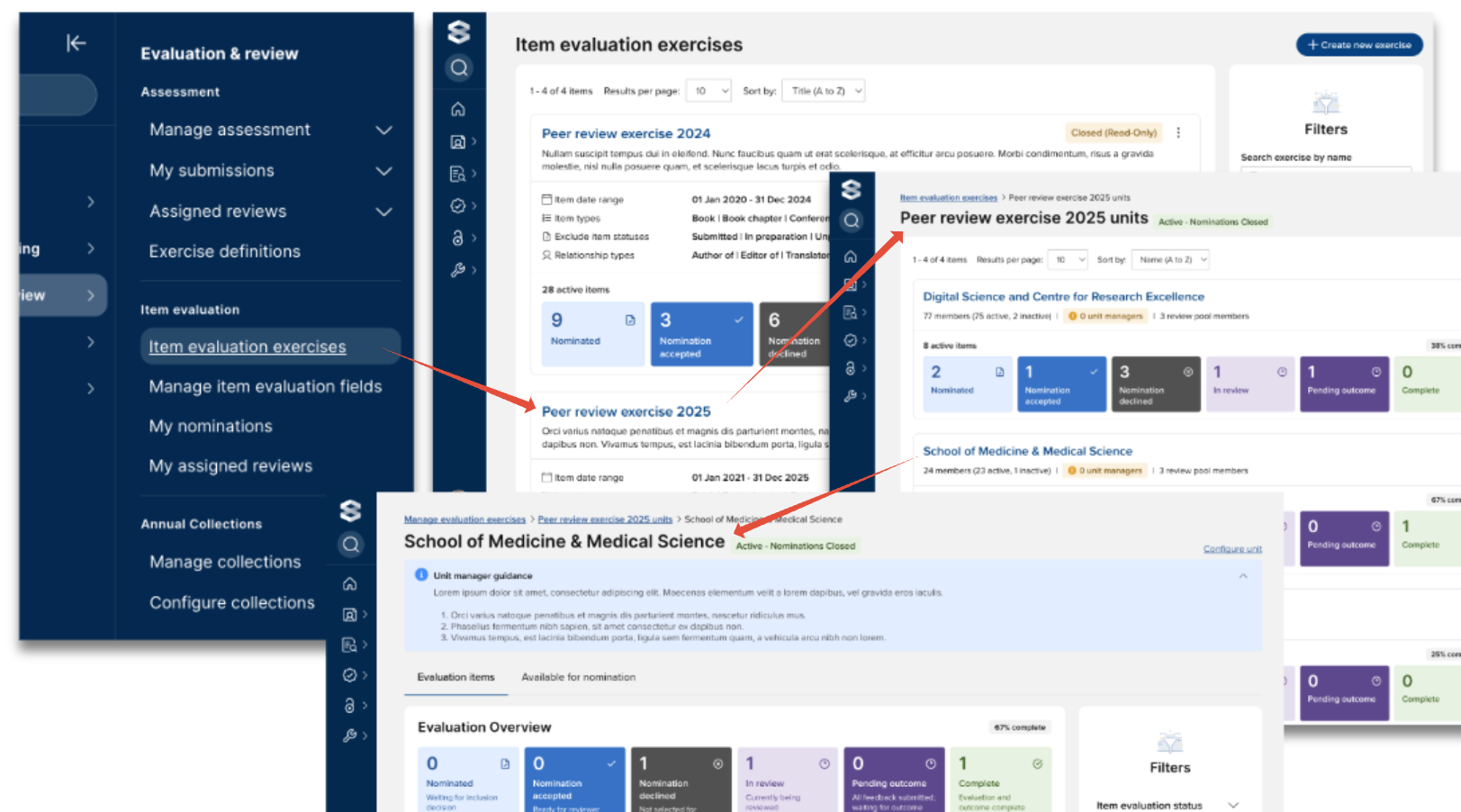 System Administrators, Research Information Administrators, and exercise unit managers can manage the nominations in each exercise unit. To access the relevant management screen, go to the desired item evaluation exercise and select the desired unit.