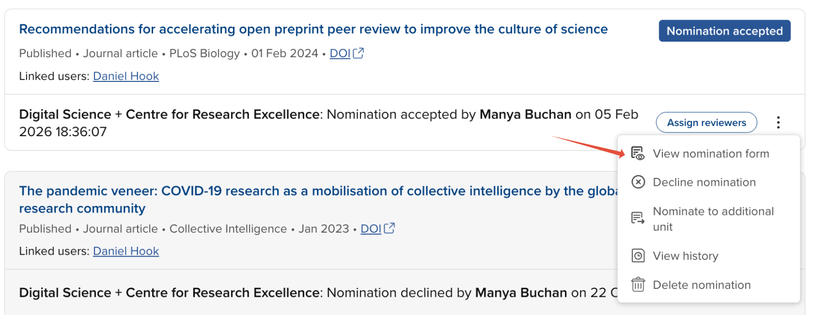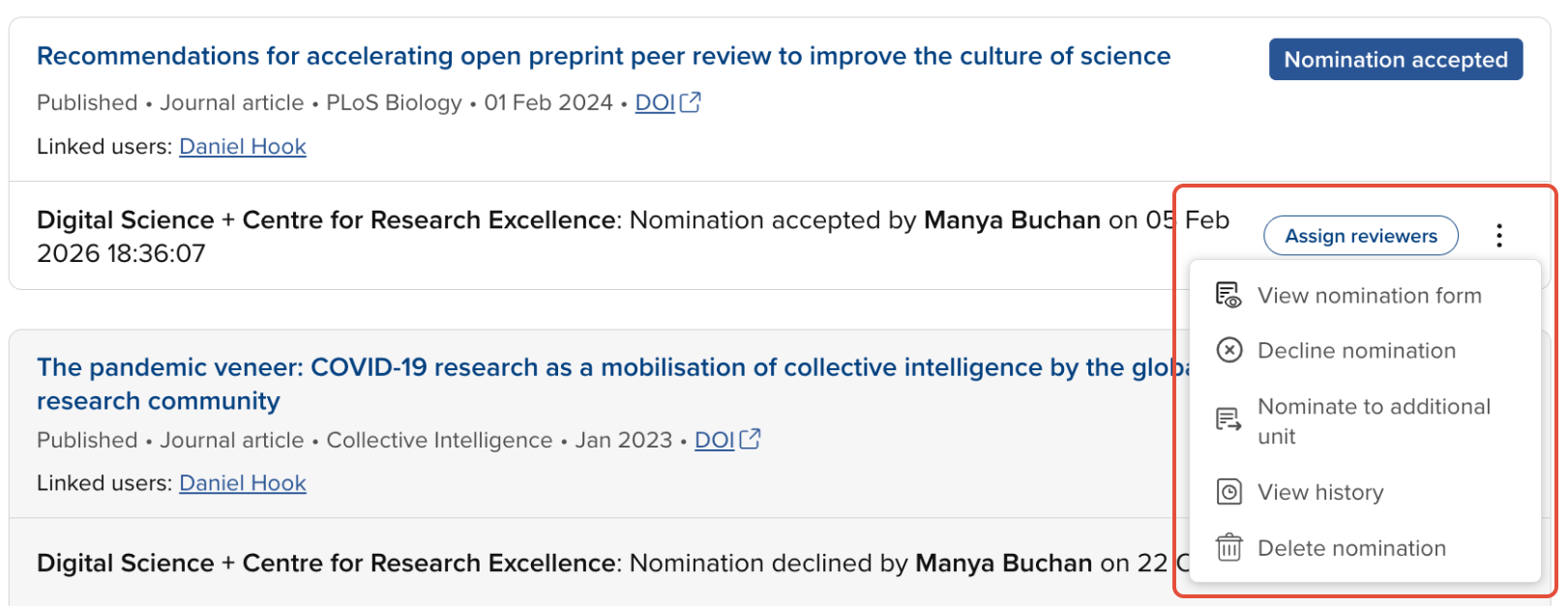 Where an item is nominated in both the unit you are managing and in another unit, the nomination(s) in the other unit(s) are visible to you, but you can perform no actions on them in this unit - they are purely presented for information (as the outcome of the other unit's review may inform actions you take in this unit).