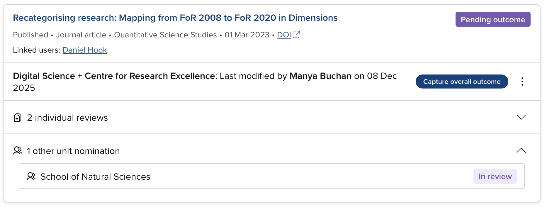 You can capture the overall outcome and move an item evaluation to Complete once all assigned reviews have been submitted or declined an the item's status is Pending outcome.