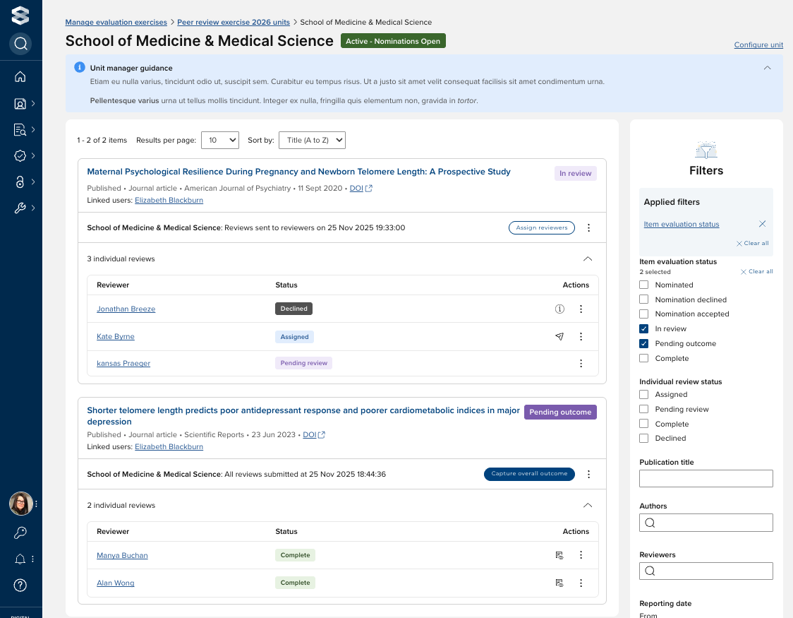 Symplectic Elements 7.2 also delivers the final foundational features of the Item Evaluation module. The module now supports a complete review workflow, from nomination and reviewer assignment through to review completion and outcome recording. Whether your reviews happen once a year or continuously, the Item Evaluation Module can help you match each output with the right reviewers, spread activity to avoid last-minute rushes, and maintain full visibility over every stage.