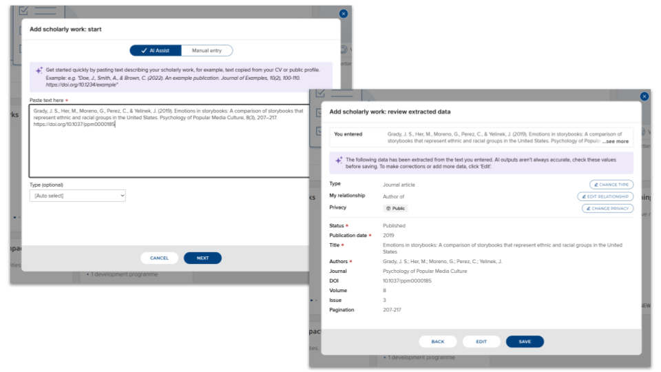 As a major step forward in this initiative, version 7.2 introduces AI assisted data entry for all Symplectic-hosted institutions. This new capability allows users to create items quickly by copying plain text directly into Symplectic Elements. AI then works quickly to extract structured metadata, which can be reviewed and saved in seconds, significantly reducing the effort required for traditional manual entry. This feature is available for four categories of data: Publications, Grants, Professional activities, and Teaching activities.