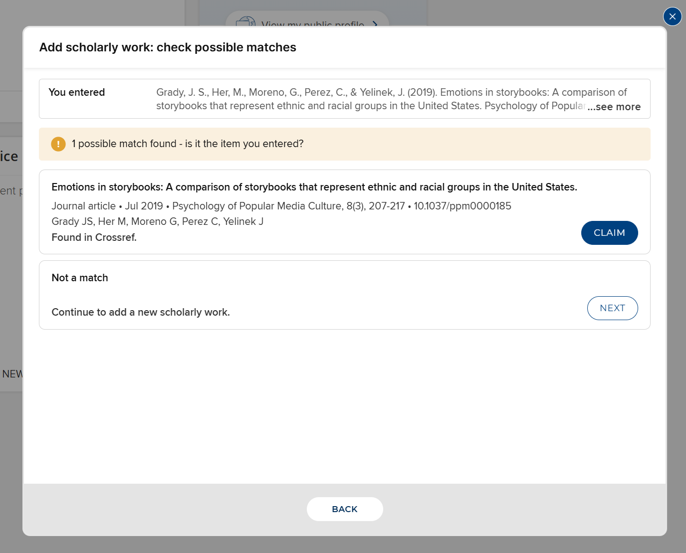 Additionally, for publications, if the text input includes a DOI, Elements will use this to check for matching items within the system and in CrossRef.