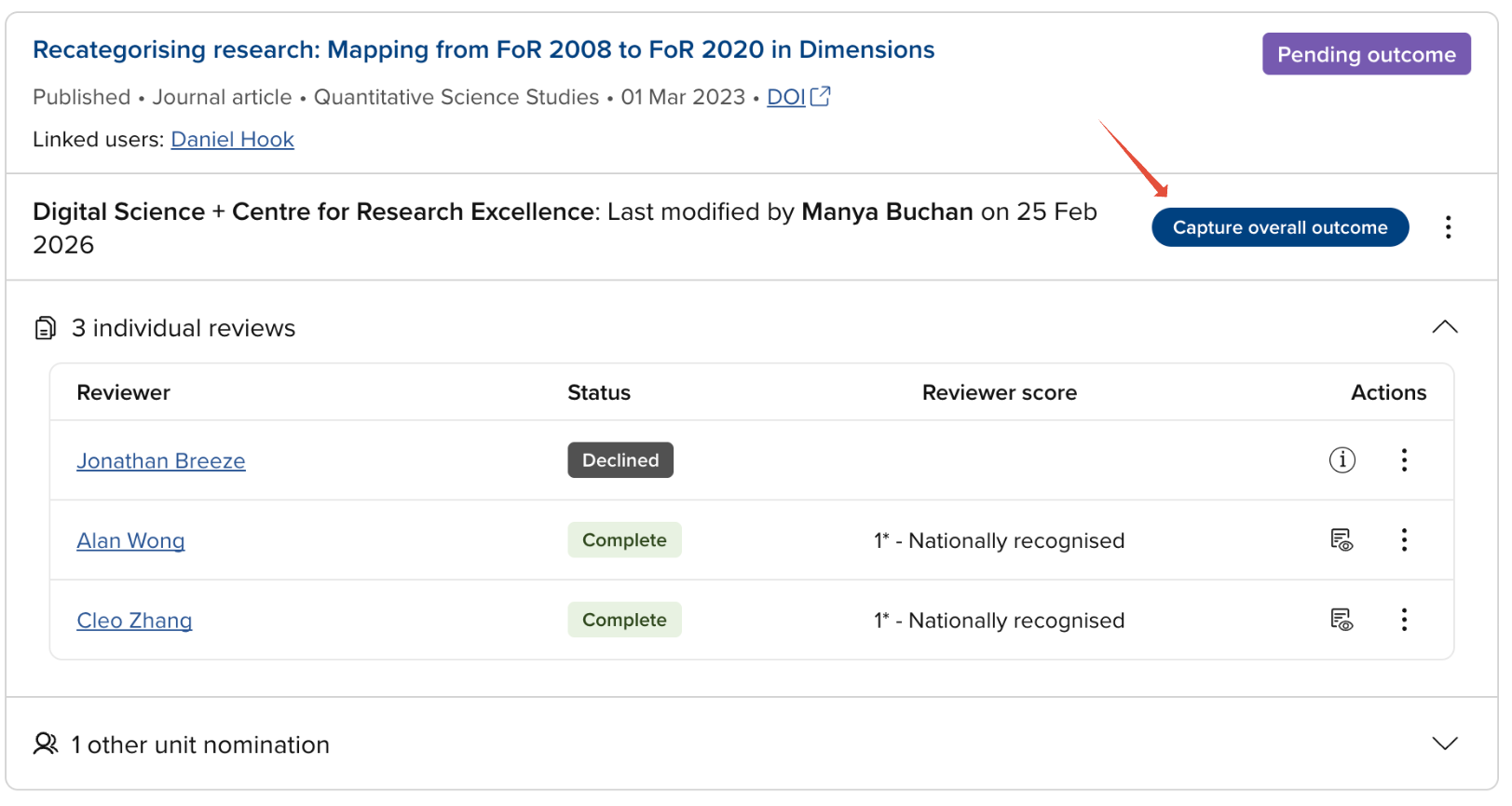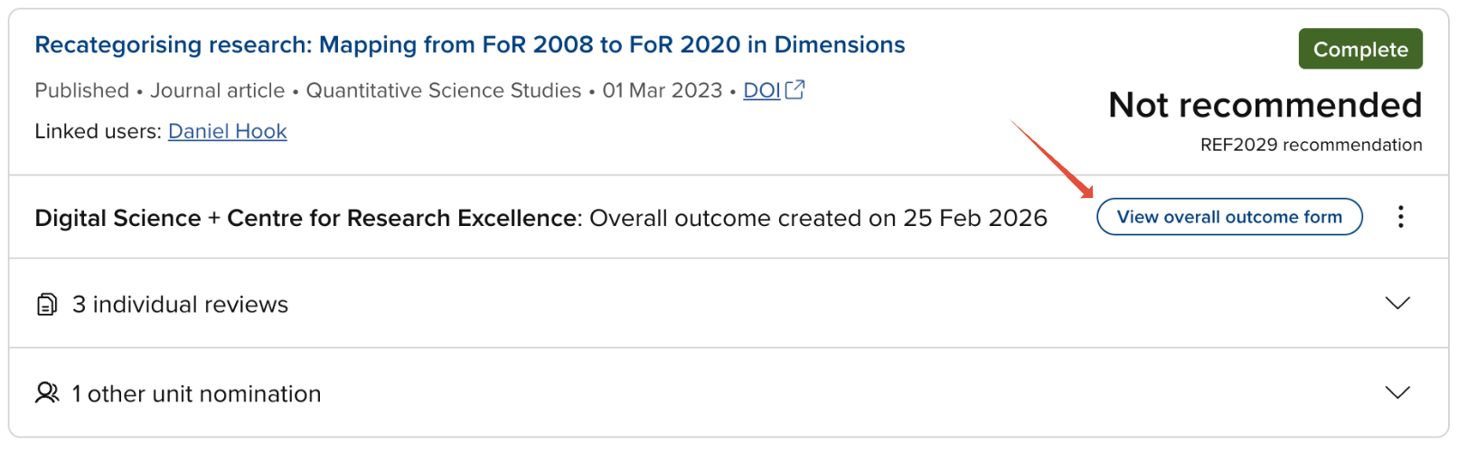 System Administrators, Research Information Administrators, and exercise unit managers can capture the overall outcome and move an item evaluation to Complete once all assigned reviews have been submitted or declined and the item's status is Pending outcome.