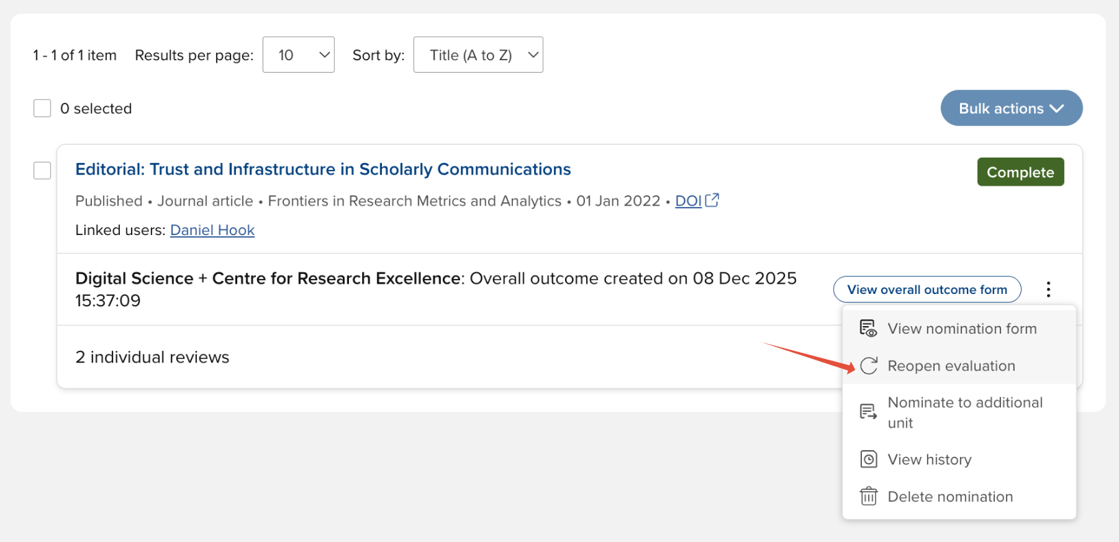 Once an item's evaluation has been completed, you may wish to reopen the evaluation, moving the status back to 'Pending outcome', which would enable you to assign and dispatch additional reviews.