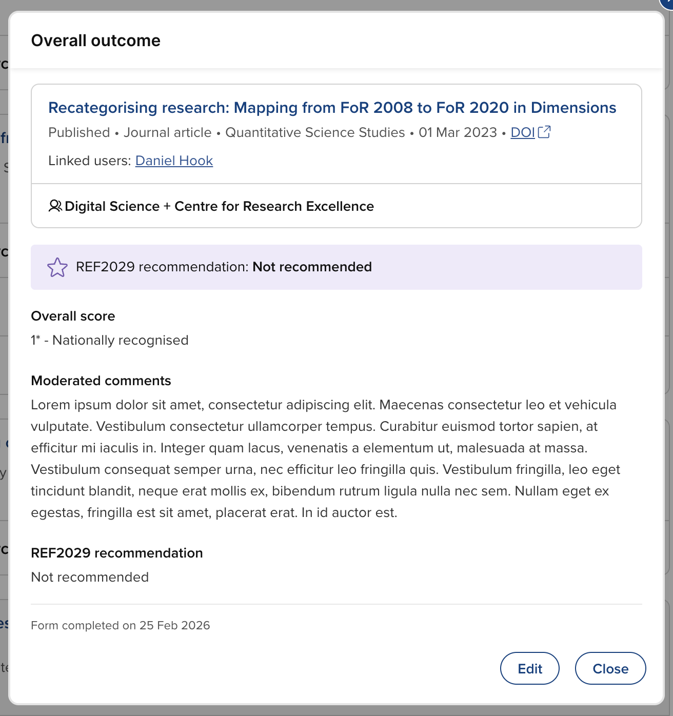Once the overall outcome has been captured and the item's evaluation status is Complete, the outcome form can continue to be viewed and edited via the 'View overall outcome form' action.