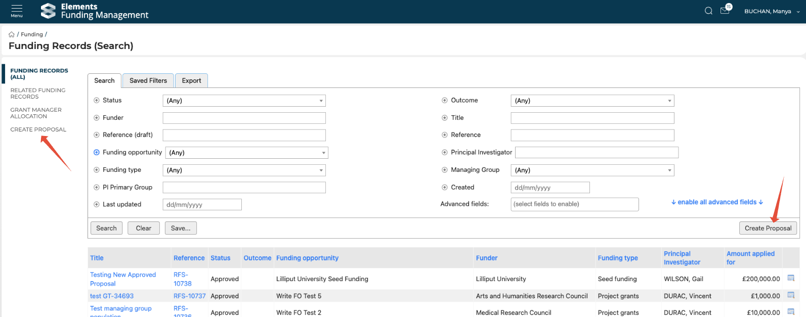 To create a proposal, go to Main menu > Funding > Funding records (search) > Create proposal.