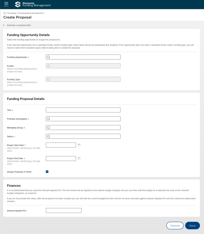 Proposal created at status = Approved | Amount applied for | Records a value against the Amount Applied For (and cannot be edited post-creation). | Mandatory |