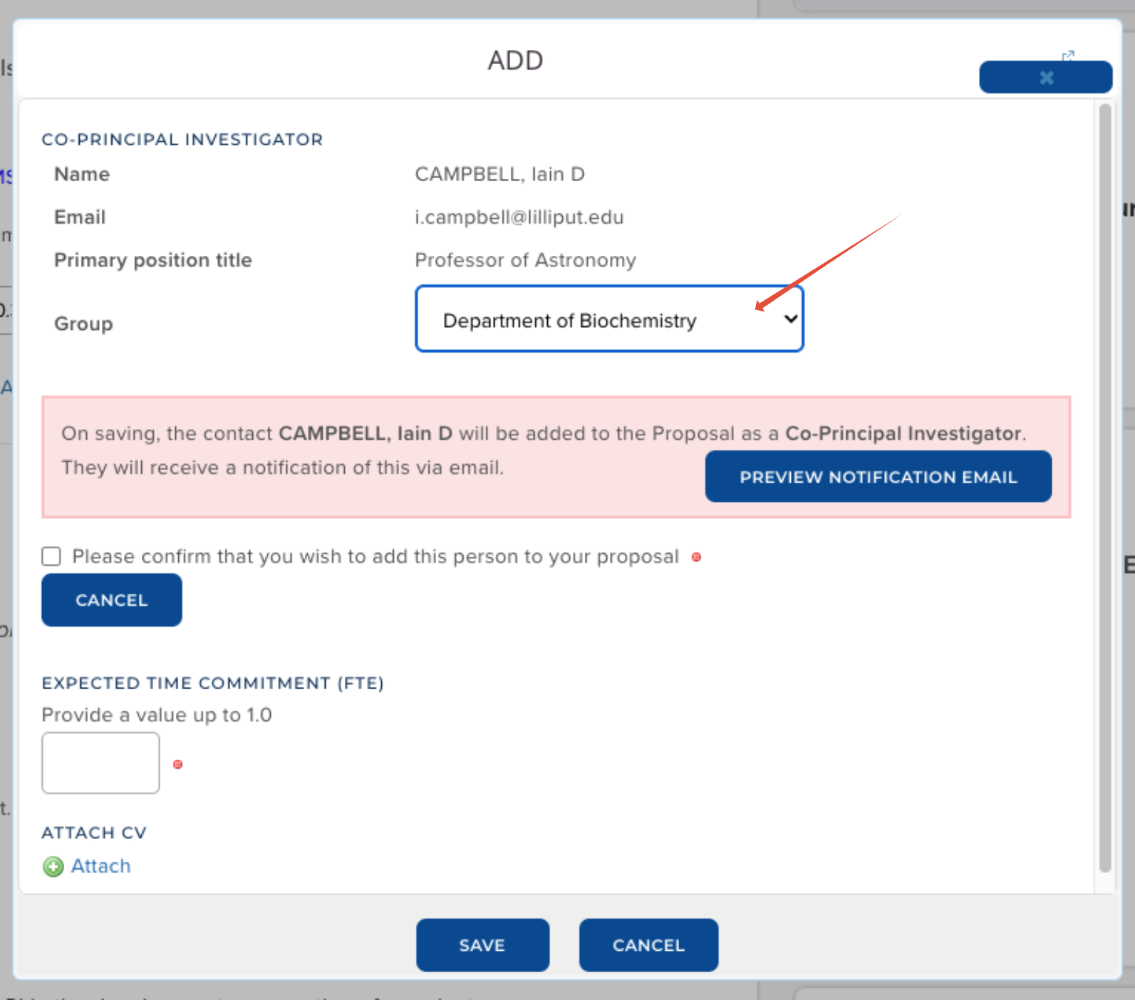 Where the PI has multiple memberships of the available group type(s) (e.g. they are a member of both the Department of Chemistry and the Department of Mathematics), all will be available for selection.