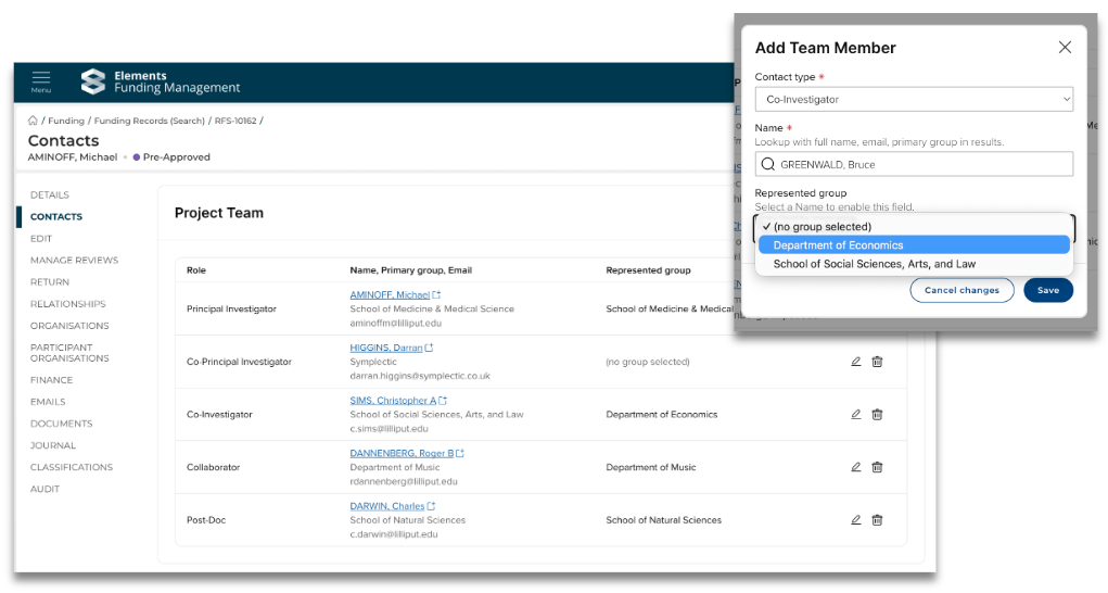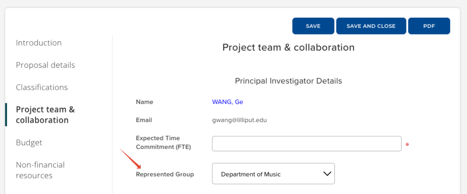 Capturing project collaborators' represented groups on a project gives greater visibility of the organisational units involved in a project, which can be valuable for many reasons, such as determining approval pathways and financial planning.
