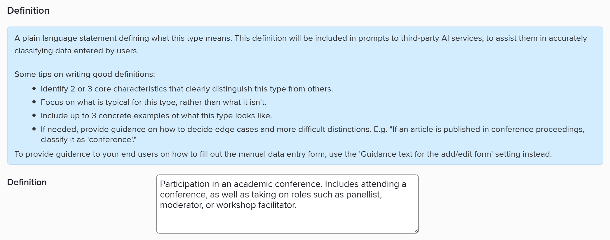 AI Assisted Data Entry adapts to the custom types and fields in your Elements system. To help AI models infer item types correctly, you should add definitions to your custom types, using the new "Definition" setting on the "edit type" admin pages.