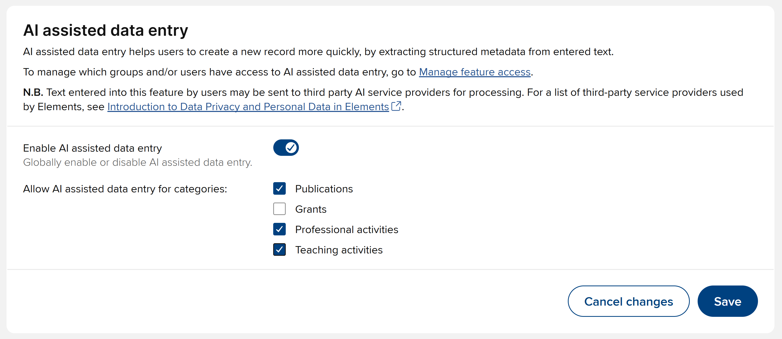 N.B. This article documents the management of AI features within the core Elements application. For details of AI-powered publication summaries in the Discovery Module, please see the dedicated Discovery Module documentation.