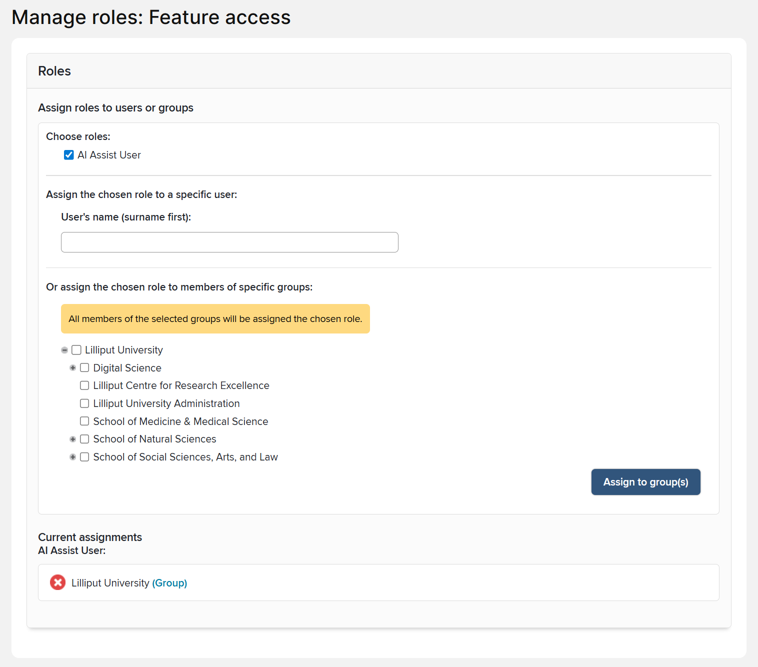N.B. By default, the AI Assist User role is granted to the top-level group, meaning that all users will have access to the feature when it is enabled. If you are restricting access, remember to remove the role from the top-level group.