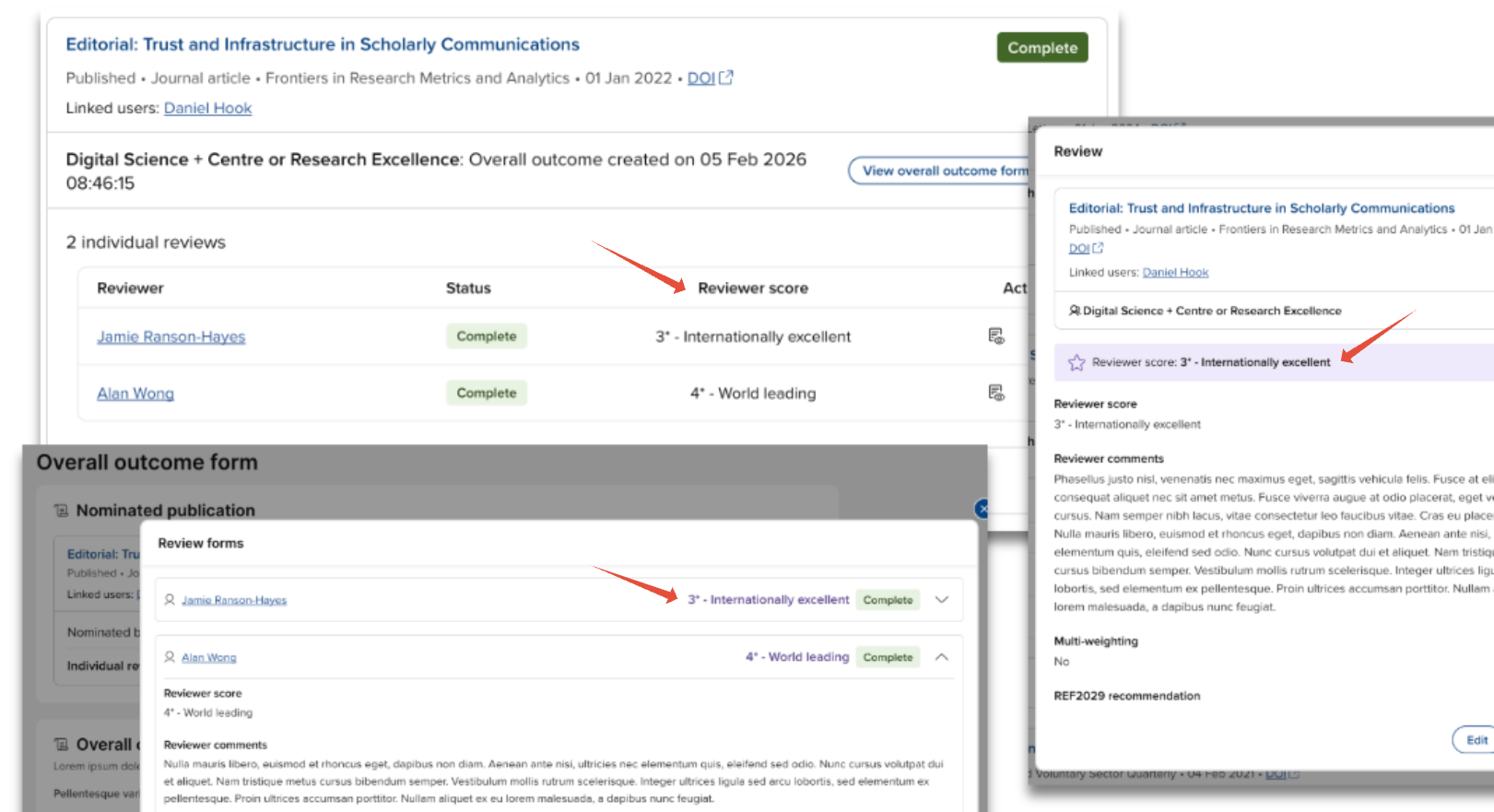 The highlighted score from the Review form is displayed on the publication card and the Review form modal, and when inspecting review outcomes from the Overall outcome form.