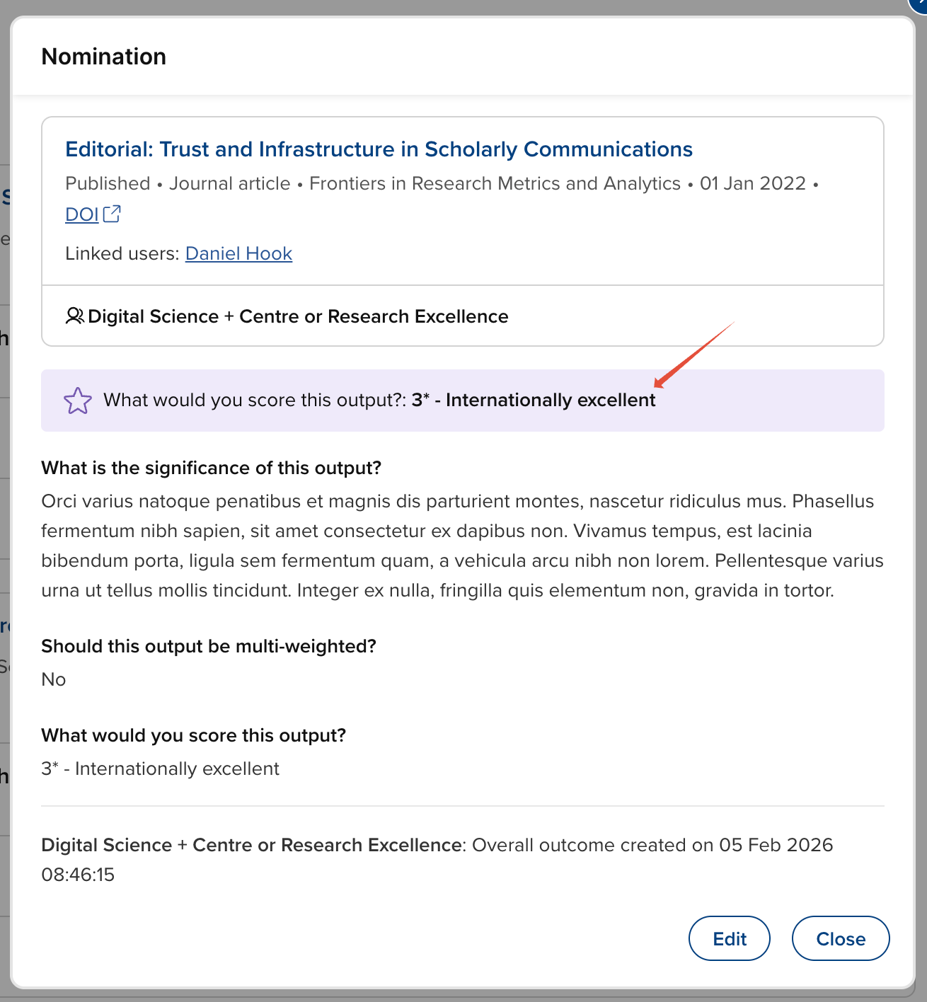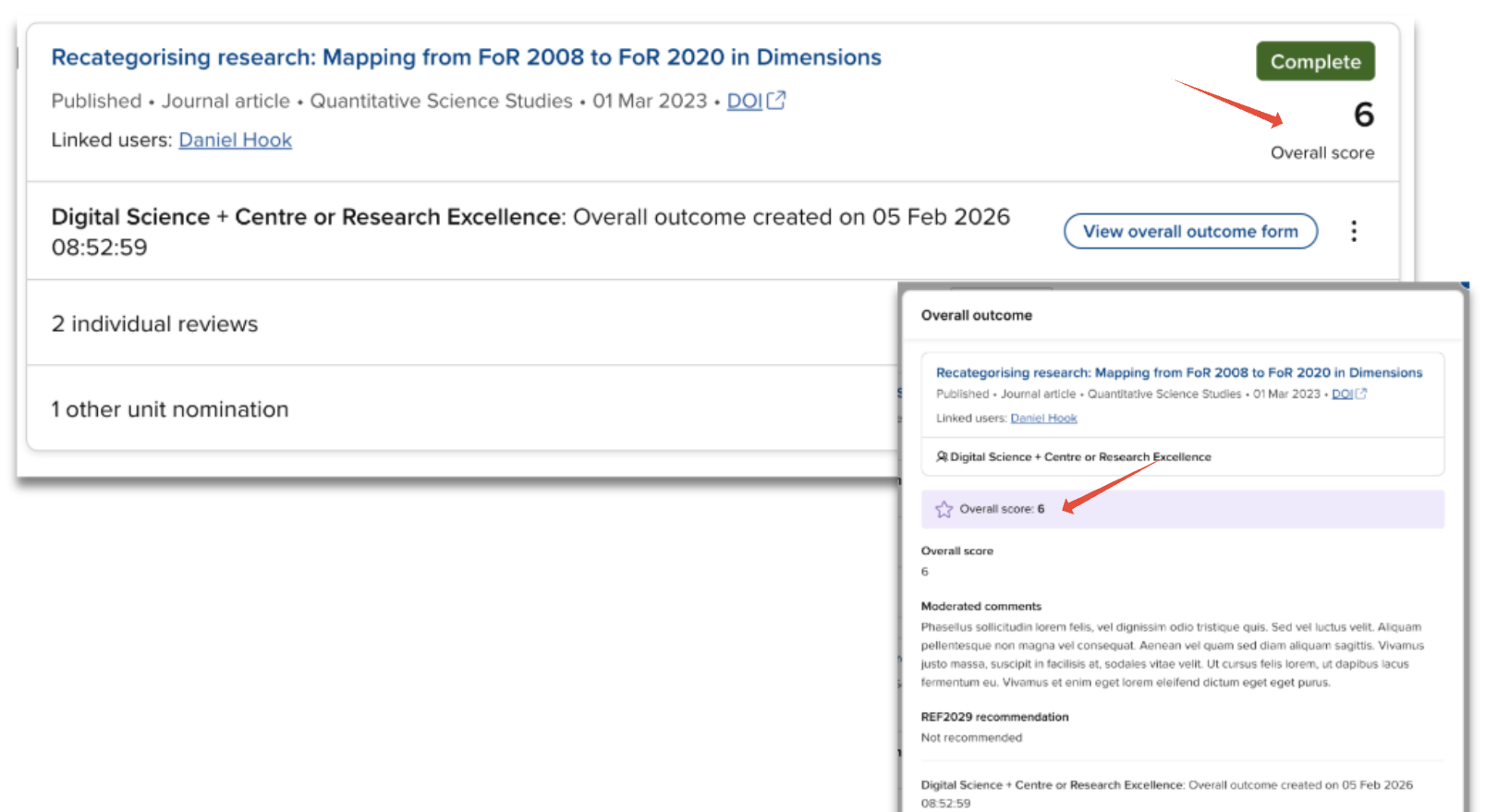 The highlighted score from the Overall outcome form is displayed on the publication card and the Outcome form modal.