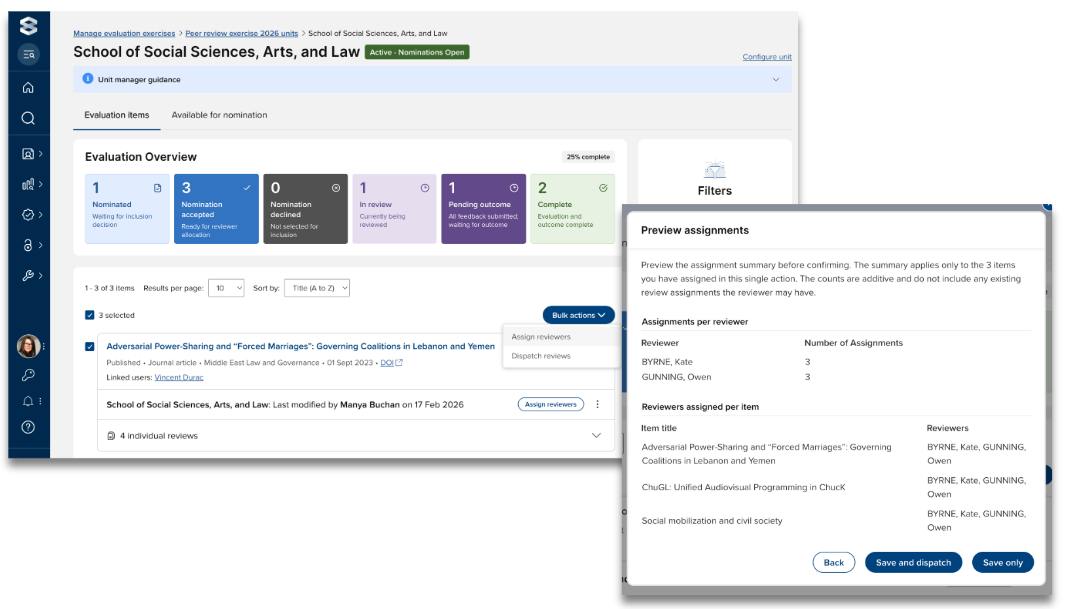 Available for items in Nomination accepted, In review, or Pending outcome status, the ‘Assign reviewers’ action allows you to select reviewers and either assign them or ‘assign and dispatch’ in a single step.