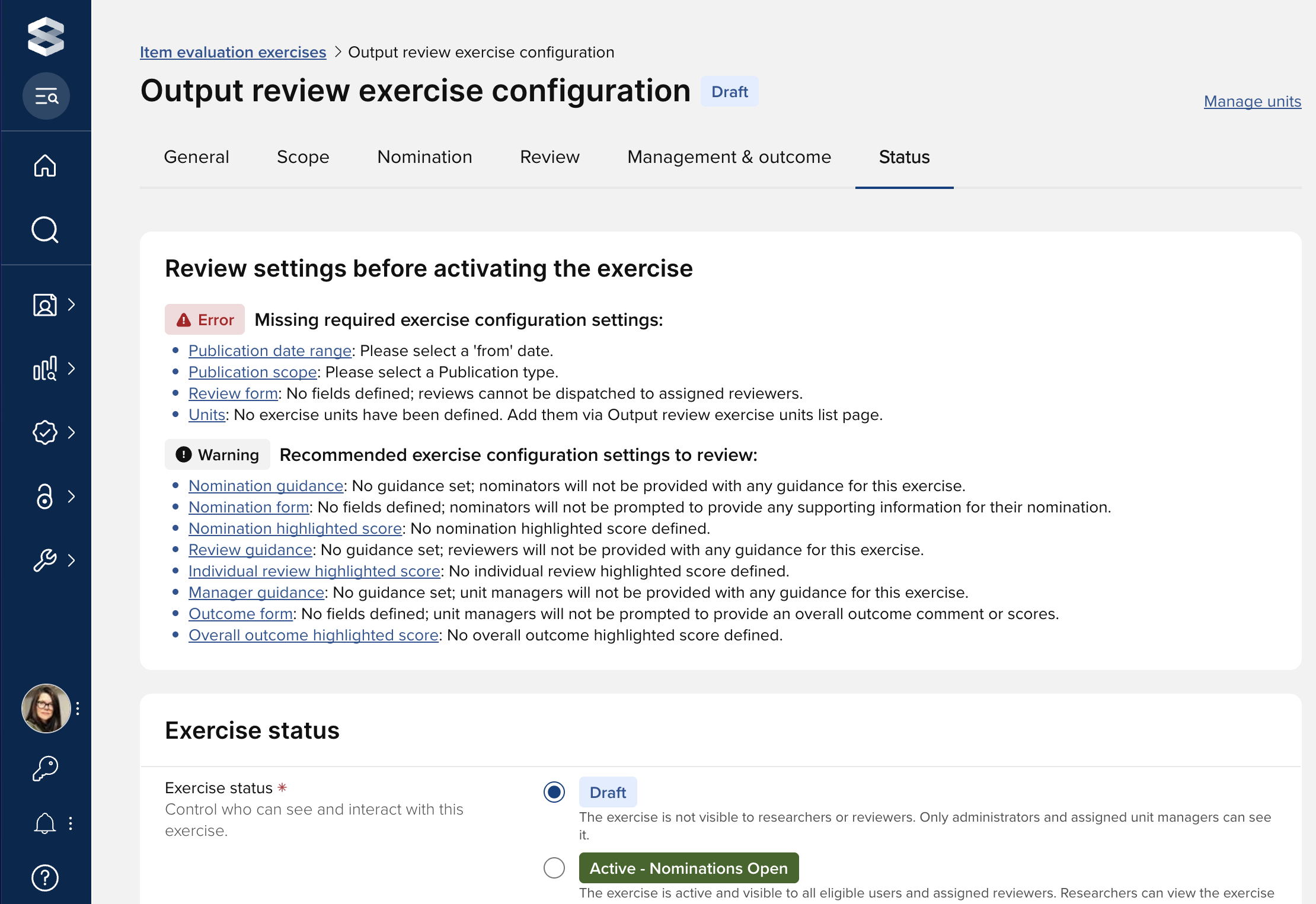 Further details on exercise configuration errors and warning notifications are available in the ‘Status’ section at the bottom of the ‘Create and configure an item evaluation exercise’ support article.