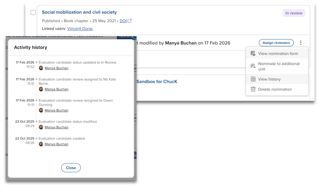 We have updated the Unit management page to include a new ‘Available for nomination’ tab where eligible but not yet nominated items are listed. From this tab, Administrators and Unit managers can now nominate an item to a Unit without needing to impersonate a linked user.