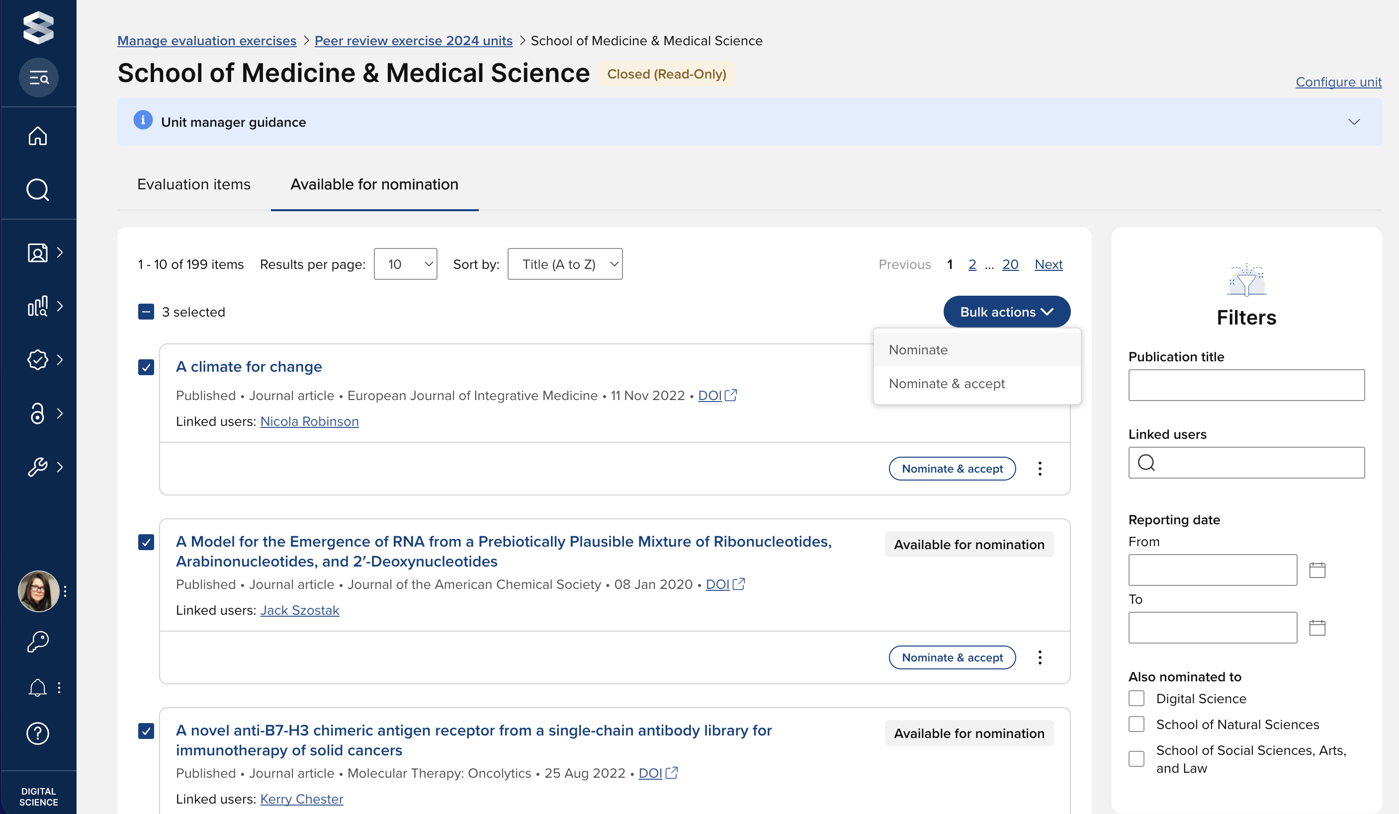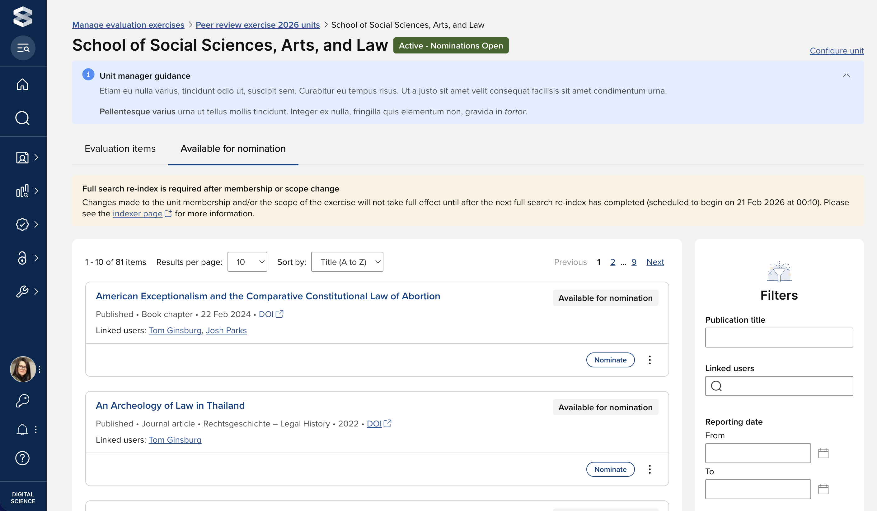 Image: ‘Available for nomination’ tab enabling Unit managers to directly nominate items for evaluation