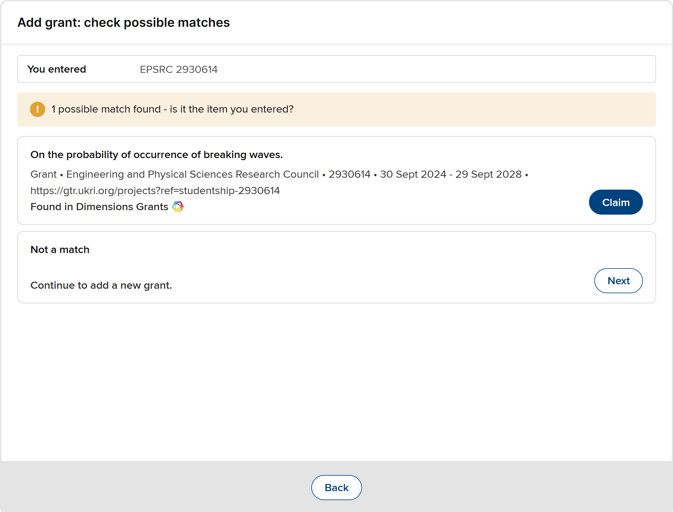 Search Dimensions for a match on funder name and grant reference number. (Requires Dimensions-As-A-Data-Source subscription)