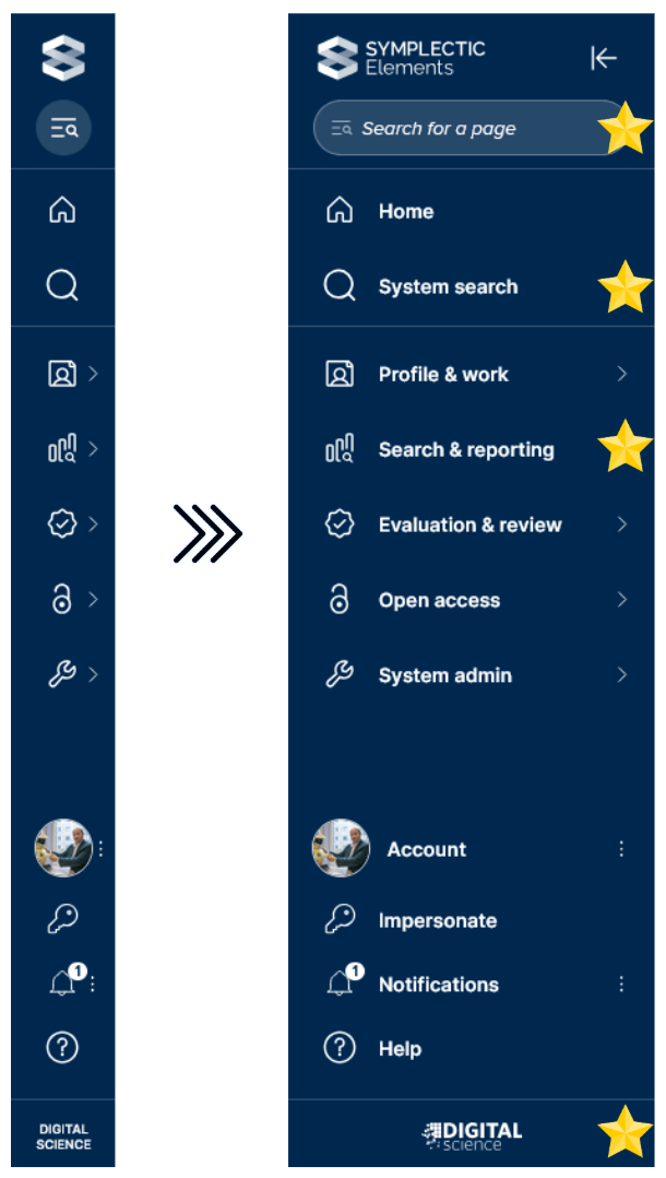 Image: The updated Elements sidebar in both a collapsed and expanded state, with star icons indicating the location of changes