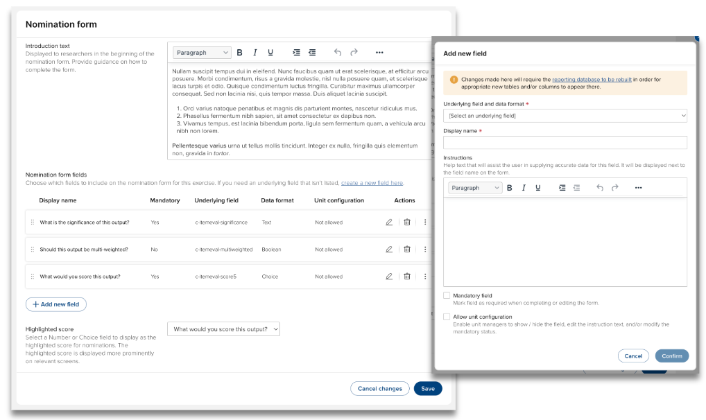 Within a single exercise, different Units may wish to ask different questions of their nominators, reviewers, and/or moderators, employ different scoresets for review outcomes, and/or tailor guidance text for their specific participants. In response to these requirements, in this release we have introduced a number of Unit-level configuration options.